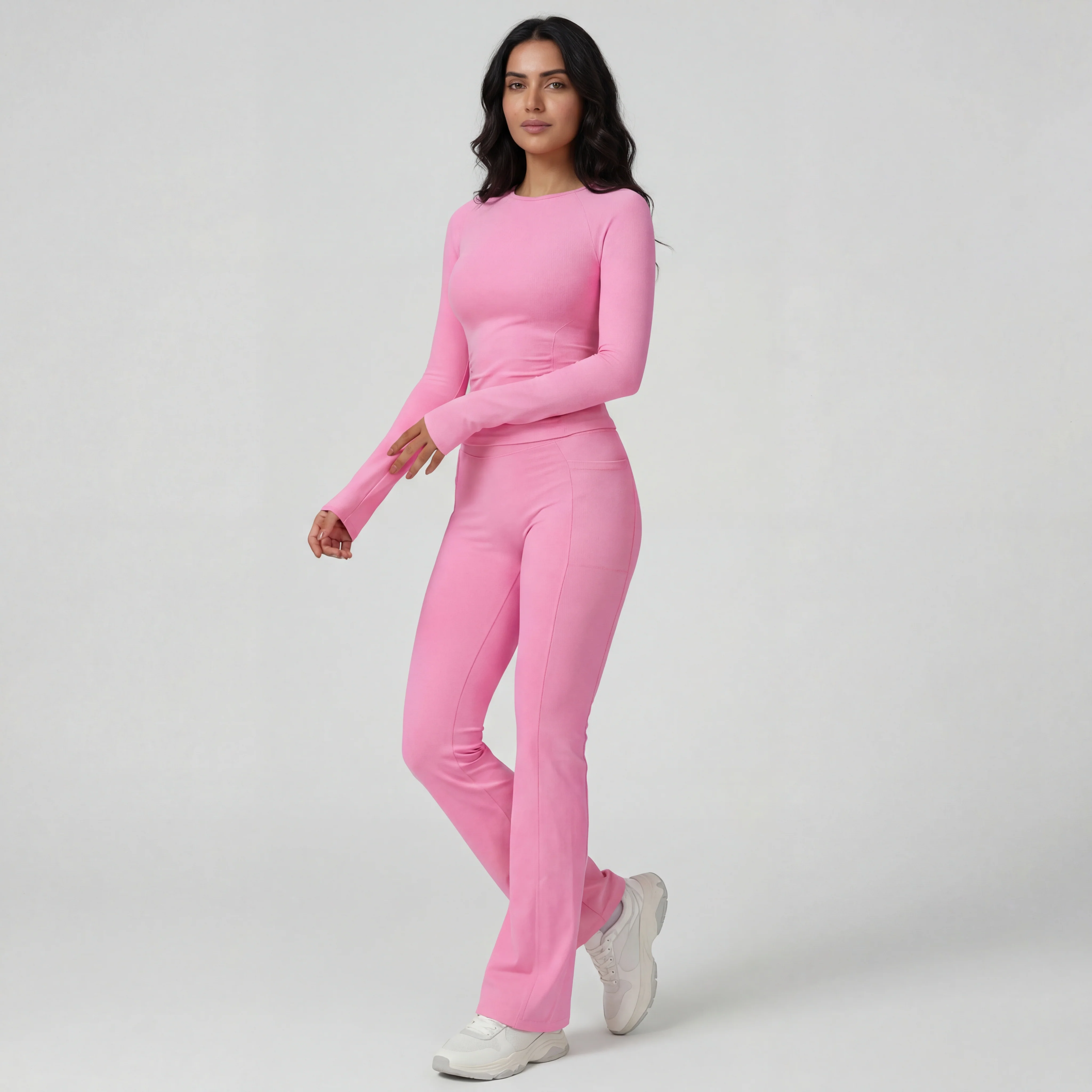 Designed to move with you from warm-ups to wind-downs, this two-piece set blends a clean, streamlined silhouette with everyday comfort. The long-sleeve top sits smooth against the body with subtle contouring seams that add shape without feeling restrictive, while the matching flared bottoms create a balanced, elongated look through the leg. Soft to the touch yet supportive, the fabric adapts to your pace—stretching, breathing, and settling back into form, making this set as easy to wear on rest days as it is during light training or travel.