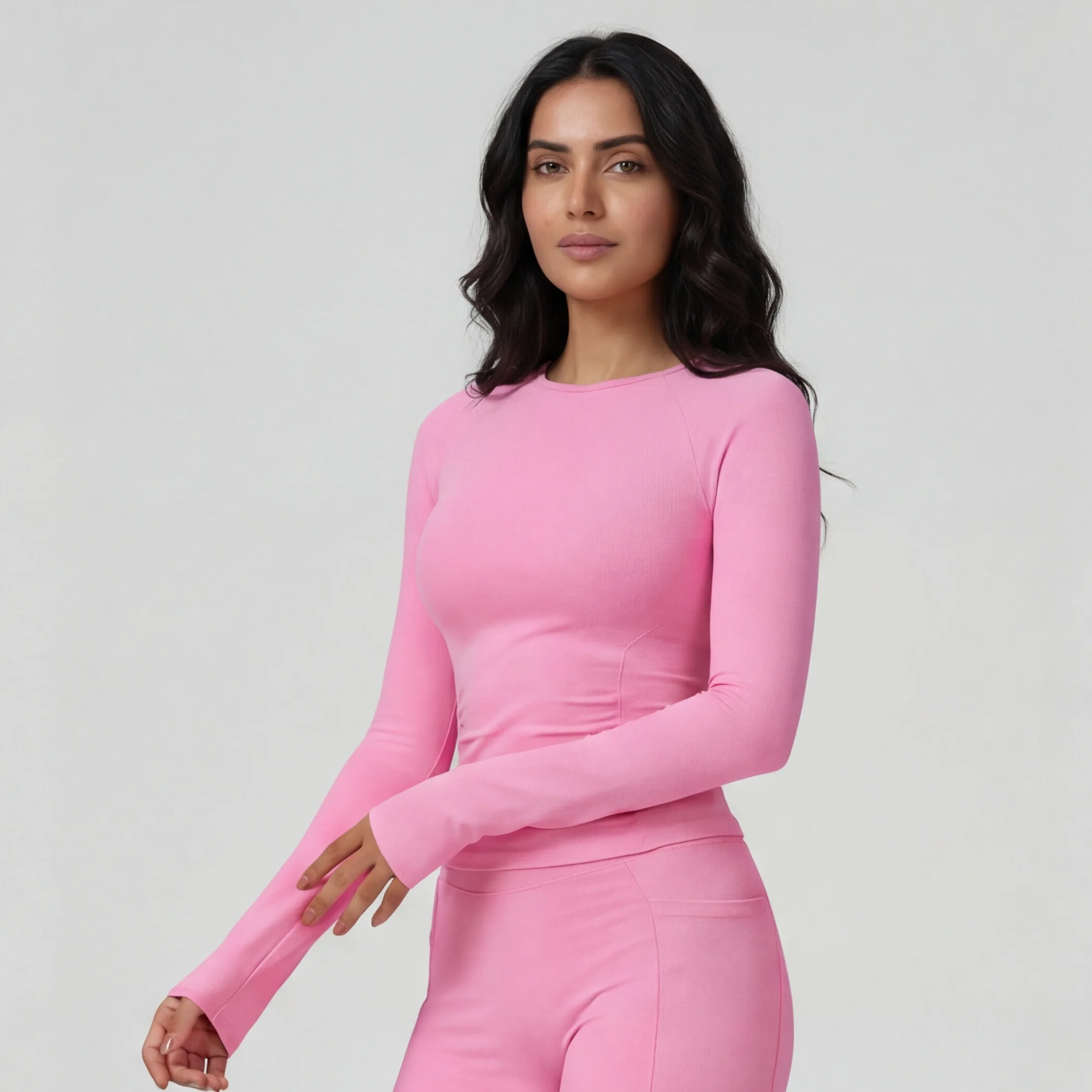 Designed to move with you from warm-ups to wind-downs, this two-piece set blends a clean, streamlined silhouette with everyday comfort. The long-sleeve top sits smooth against the body with subtle contouring seams that add shape without feeling restrictive, while the matching flared bottoms create a balanced, elongated look through the leg. Soft to the touch yet supportive, the fabric adapts to your pace—stretching, breathing, and settling back into form, making this set as easy to wear on rest days as it is during light training or travel.