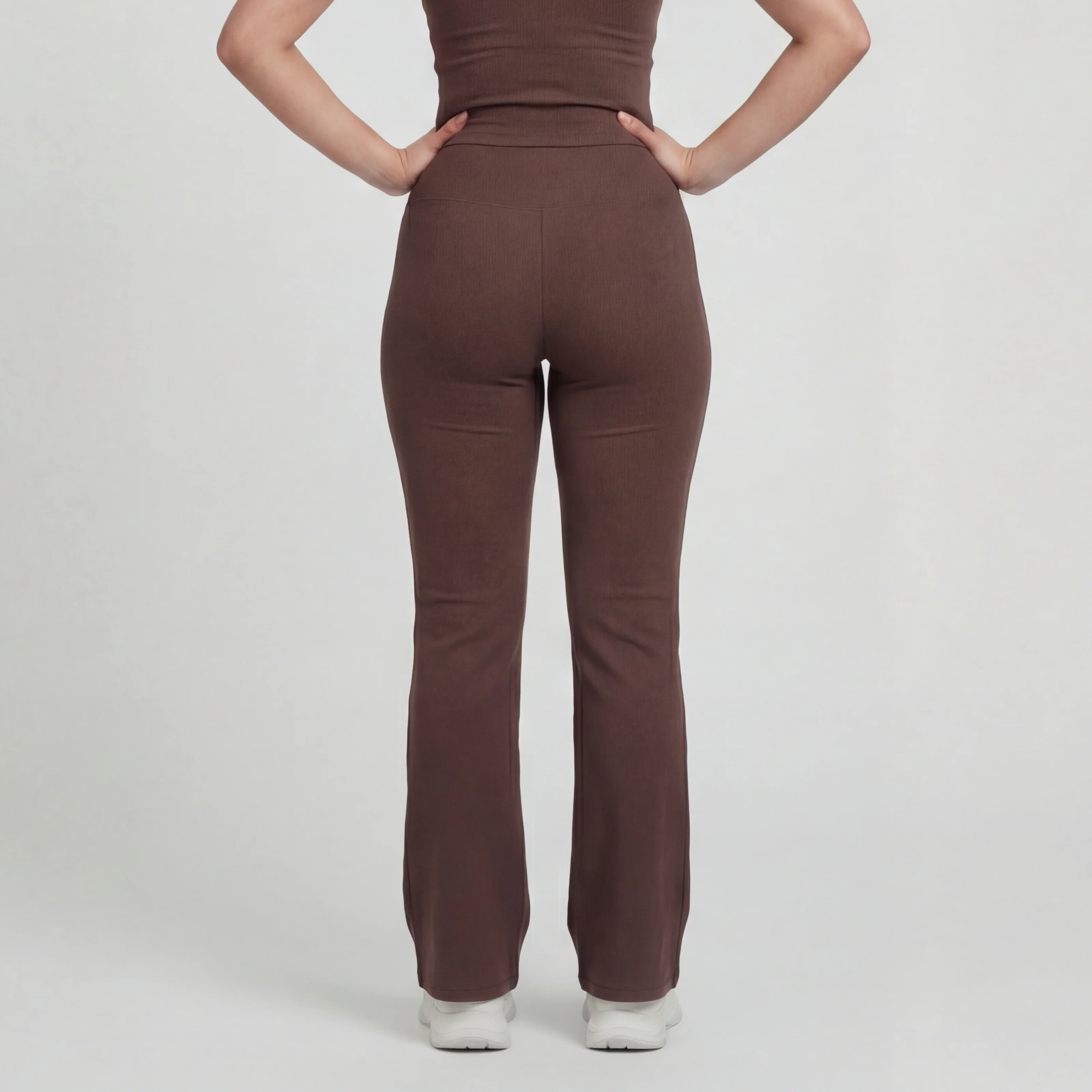 This bottom designed to balance clean lines with effortless movement. The high-waist flared leggings, the silhouette is elongated and flattering, with a subtle V-shaped back seam that enhances natural curves without feeling restrictive. Crafted from a soft nylon–spandex blend, the fabric stretches easily with the body, dries quickly, and remains breathable through long hours of wear. Polished yet relaxed, this set transitions seamlessly from workouts to everyday athleisure, making it ideal for yoga, training, travel, or styled casually outside the studio.