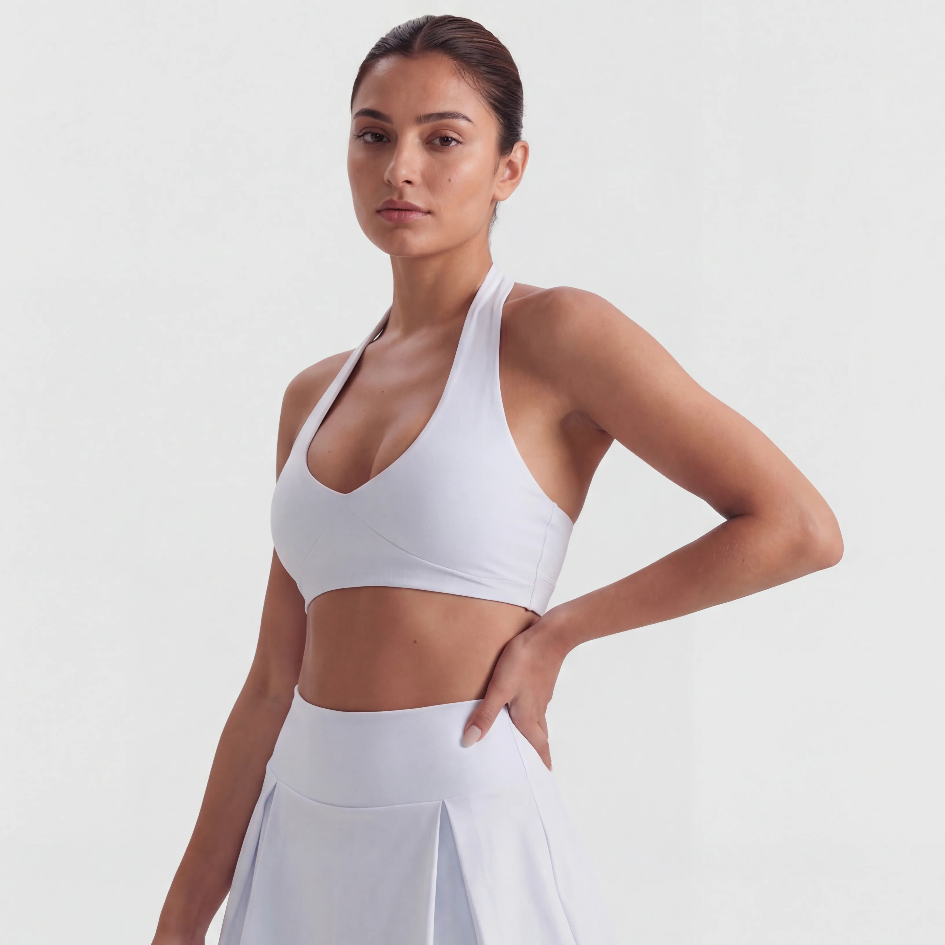 Designed for movement and made to feel effortless, this two-piece set balances a clean, feminine silhouette with all-day comfort. The halter bra offers a flattering open-back look while staying supportive, and the skirt flows naturally with every step thanks to its soft drape and built-in coverage. Light on the body and smooth against the skin, it’s the kind of set you reach for when you want to feel confident, comfortable, and put together without trying too hard.
