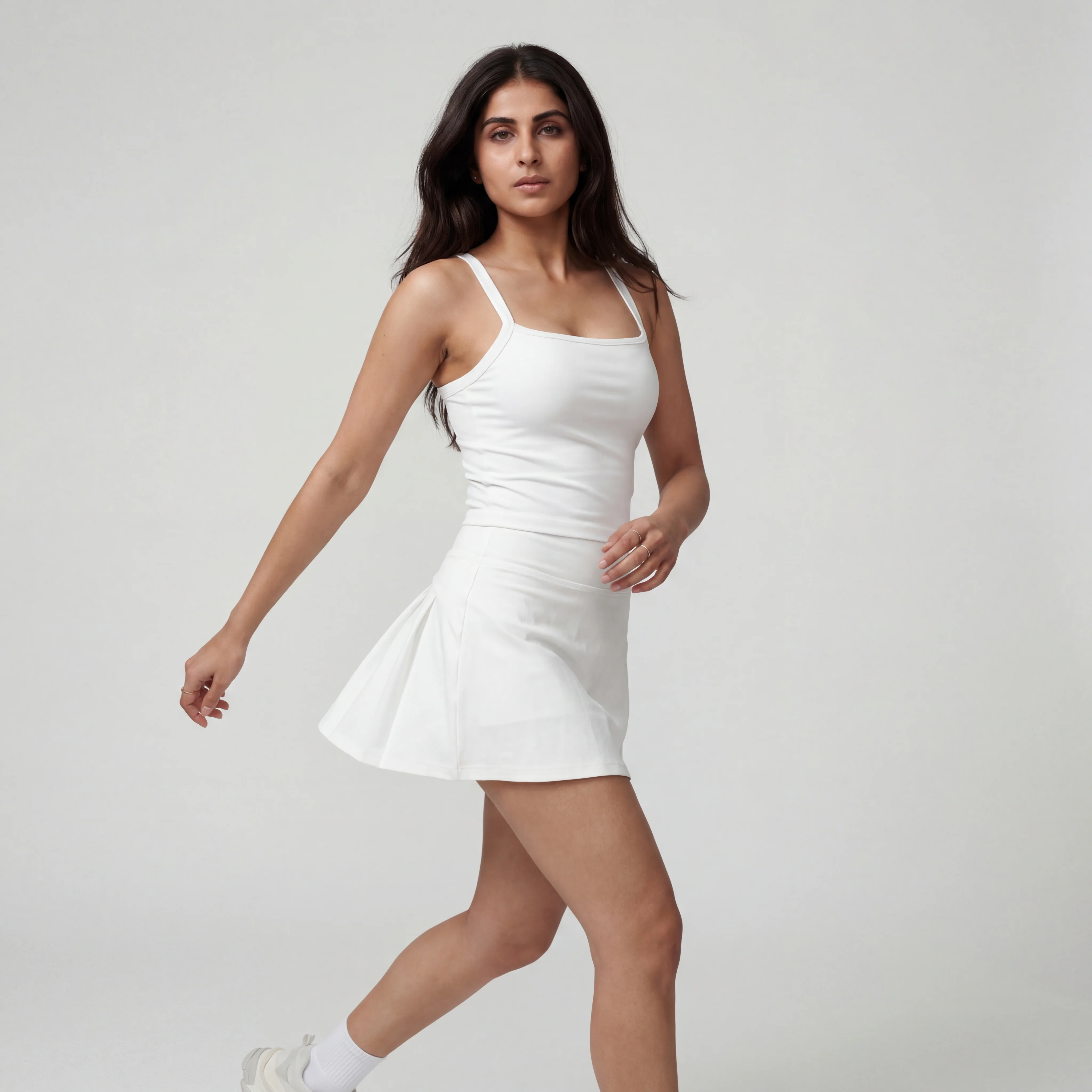Designed for movement and everyday ease, this activewear set balances function with a clean, athletic look. The fitted top offers reliable support with removable chest cushions, letting you adjust the feel based on your activity, while the extended hem provides added coverage and a secure fit. Paired with a high-waist skirt featuring side storage pockets, this set keeps essentials close without disrupting movement. The fabric feels smooth and flexible, stretching naturally with your body and staying comfortable from workouts to casual wear.
